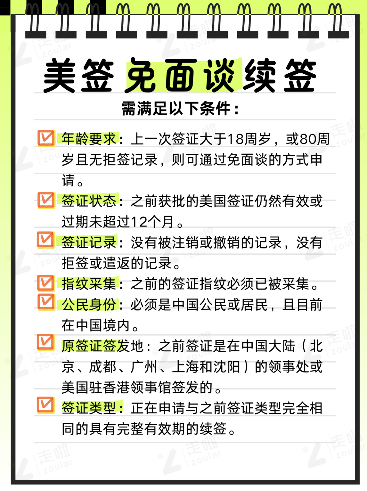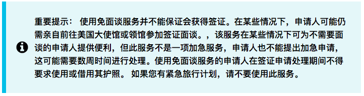 - 申请免面谈续签并不能保证一定会获得签证,在某些情况下,仍可能需要申请人前往领馆面谈。