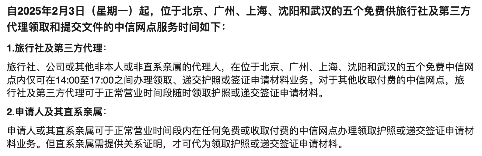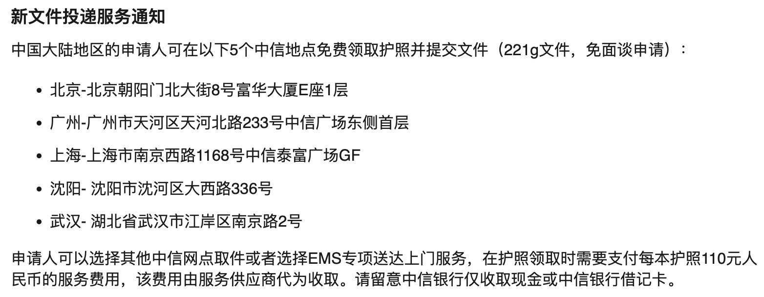 - 除北京、上海、广州、沈阳、武汉5个免费网点外,其余中信银行支行领取护照需支付110元/人费用。