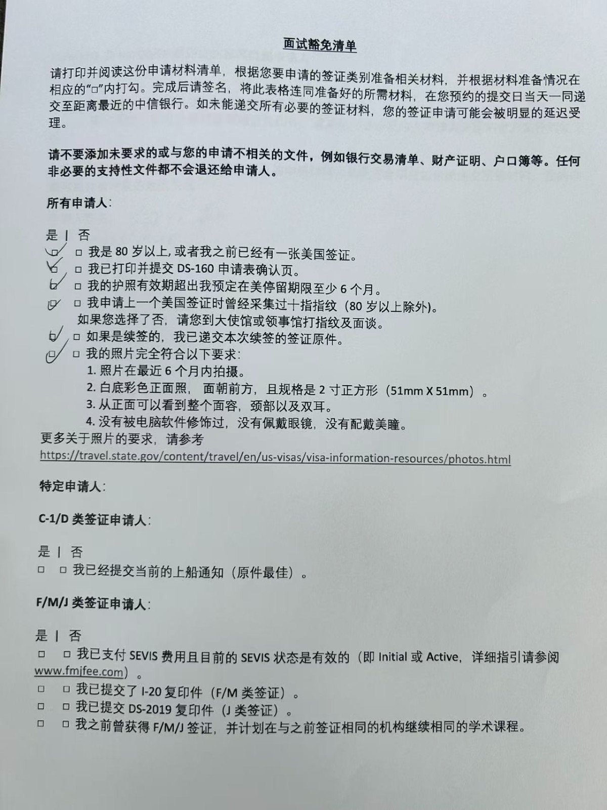 - 7、面试豁免清单,勾选对应情况(都选是),第二页签字处签字,拼音或者中文均可,可以家里人代签。