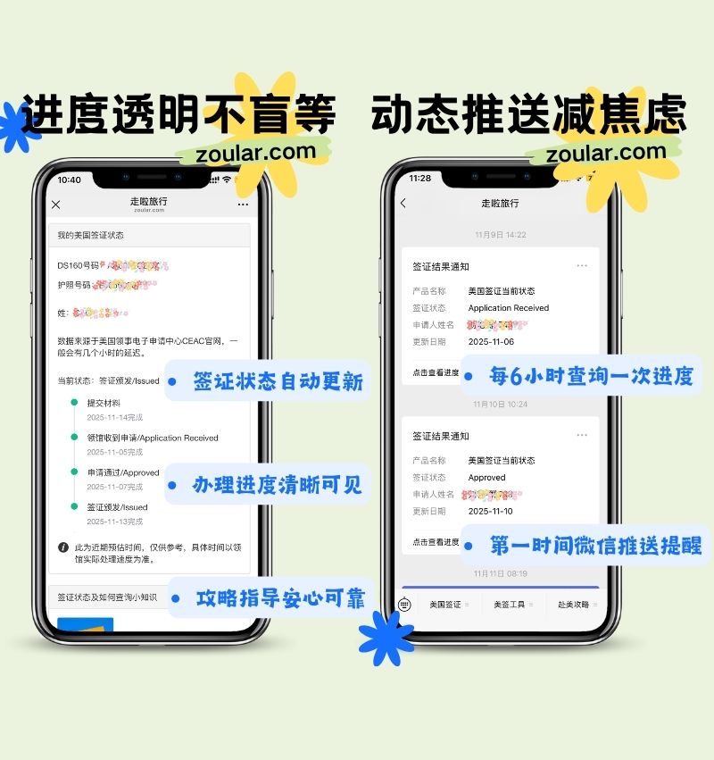 2、走啦美签状态跟踪小工具,美签状态更新,自动推送通知,美签续签办理时间线清晰明了!