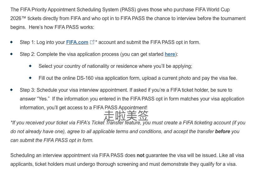 Q:走FIFA PASS通道能保证签证获批吗? 不能。通过FIFA PASS预约仅能获得优先面试机会,不保证签证获批。所有申请人(包括球迷)都需接受严格的安全审查,并证明自己符合签证资格。