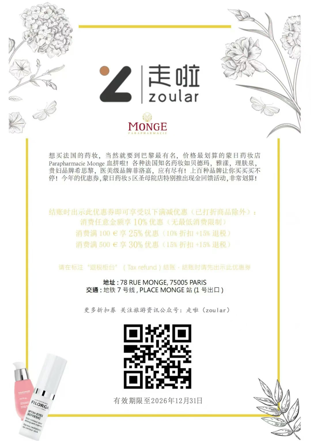 【2026】走啦特别优惠法国巴黎蒙日药妆店 Pharmacie Monge 85折优惠券